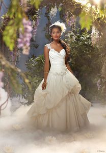 Snow White’s gown offers a lovely tulle ball gown shape, a draped satin bodice, as well as lace vines and flower adornments peeking out from the skirt. Finally, Tiana’s gown offers a form-fitting silhouette, an organza skirt, and a lace and crystal sweetheart neckline.