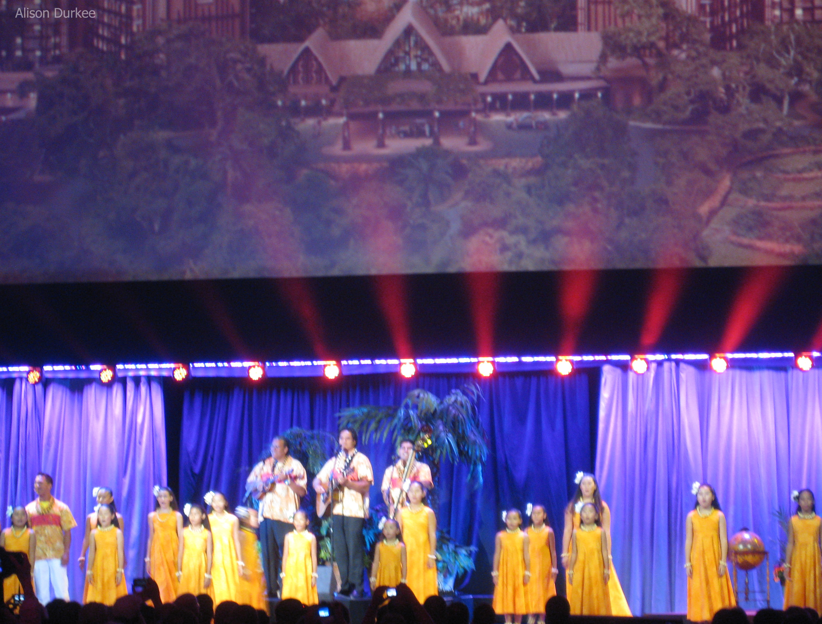 The grand opening of Aulani, A Disney Resort and Spa is just days away now, and guests at the D23 Expo’s Walt Disney Parks and Resorts arena presentation were treated to some new looks at the brand-new resort. The section of the presentation was kicked off with a performance by traditional Hawaiian dancers and singers, giving the audience a taste of the exotic culture they can expect at the new resort.