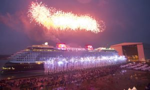 The Dream, one of two new ships that are being built for Disney in Papenburg, Germany, made her first public appearance during a gala “float out” ceremony, complete with fireworks and special guests. Donald Duck waved from the deck to Mickey Mouse, who waved back from shore, as his newest ship made its way into the harbor.