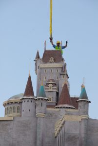 Forced perspective can most easily be described as a type of optical illusion. By manipulating the size and scale of a building based on the angles it will be viewed from, Imagineers can trick your eye into believing an object is larger than it actually is. The above photos show construction crews hard at work building the castle.
