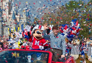 Arriving in Orlando directly from Indianapolis, New York Giants’ quarterback and Super Bowl MVP Eli Manning spent part of the day yesterday enjoying himself at Walt Disney World’s Magic Kingdom. After Manning rode down Main Street during a ticker tape parade celebrating his team’s victory, he posed for pictures with Mickey, Minnie, and some of the NFL Youth Players, who were also in attendance. If you didn’t get to see the parade firsthand, we wanted to give you a glimpse of all the fun.