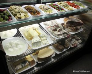 refrigerator filled with meats, cheeses and antipasto ingredients. To add to the decor, Tutto Gusto has wine fridges lining the far wall. They also offer a fireplace alcove complete with couches, stools, ceramic artwork and a fireplace for park guests to relax and enjoy the atmosphere after a long day in the parks.