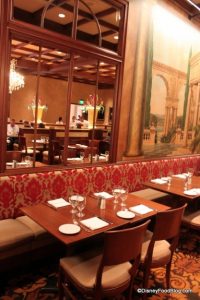 For the renovation of Epcot’s “fancy” Tutto Italia restaurant, you’ll notice that the restaurant kept some of the features from prior to the refurbishment, such as the Italian murals, lighting fixtures and the option of dining in the “sun room” orĀ main dining area. However, the majority of the indoor seating has changed to booths and an outdoor patio area has been added. A new dish has also been added to the