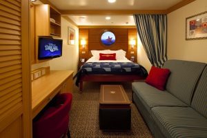 The portholes show real time views of the ocean, thanks to four high-definition cameras mounted along the ship, and the view you see corresponds to your room’s position. So, if your room is on the starboard side of the ship, that’s what you see in your porthole. And there is, of course, more. Because you also have surprise visitors in your porthole – as familiar Disney faces, like Peach the starfish, Dumbo, and even Mickey himself, appear throughout the day.