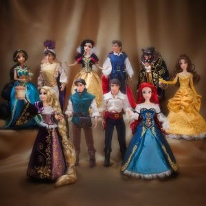 This much-anticipated Limited Edition Disney Fairytale Designer Doll Collection features five Disney Princesses and their leading men. The collection includes Snow White and the Prince, Rapunzel and Flynn Rider, Jasmine and Aladdin, Belle and the Beast, and Ariel and Prince Eric.