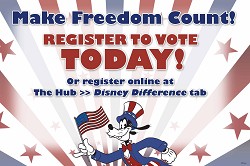 On September 14, 2010 the Orange, Osceola and Polk County supervisors of elections will be working with Disney to host voter registration drives for cast members at several location across the Walt Disney World Resort. Just in time for the 2010 elections, the upcoming event is part of Disney’s continual “Make Freedom Count” campaign which educates and encourages Disney cast members to make their voice heard. “Make Freedom Count” even provides a link on the internal cast member website where CMs can register to vote with the click of a mouse.