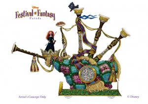The float that will carry Merida and her three brothers (in their bear form) features a troupe of Scottish dancers and looks like a very large – and brightly colored – bagpipe.