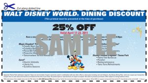 To take advantage of 25% savings, guests must dine before 11:30 a.m. or between 3:00-4:30 p.m. You can print your voucher by visiting the Disney Parks Blog, or you can find it in the Walt Disney World Resort Times Guide.