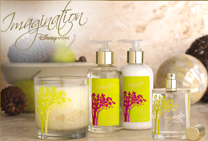 The first fragrance in the collection is Imagination, which debuts nationwide as home fragrance products in June 2011. This fragrance is inspired by Disney Store’s trees that line the path of their new Imagination Park stores. The scent instills a natural and calm feeling, as it evokes the scents of an enchanted forest filled with sequoia trees, green leaves, and cool moss.