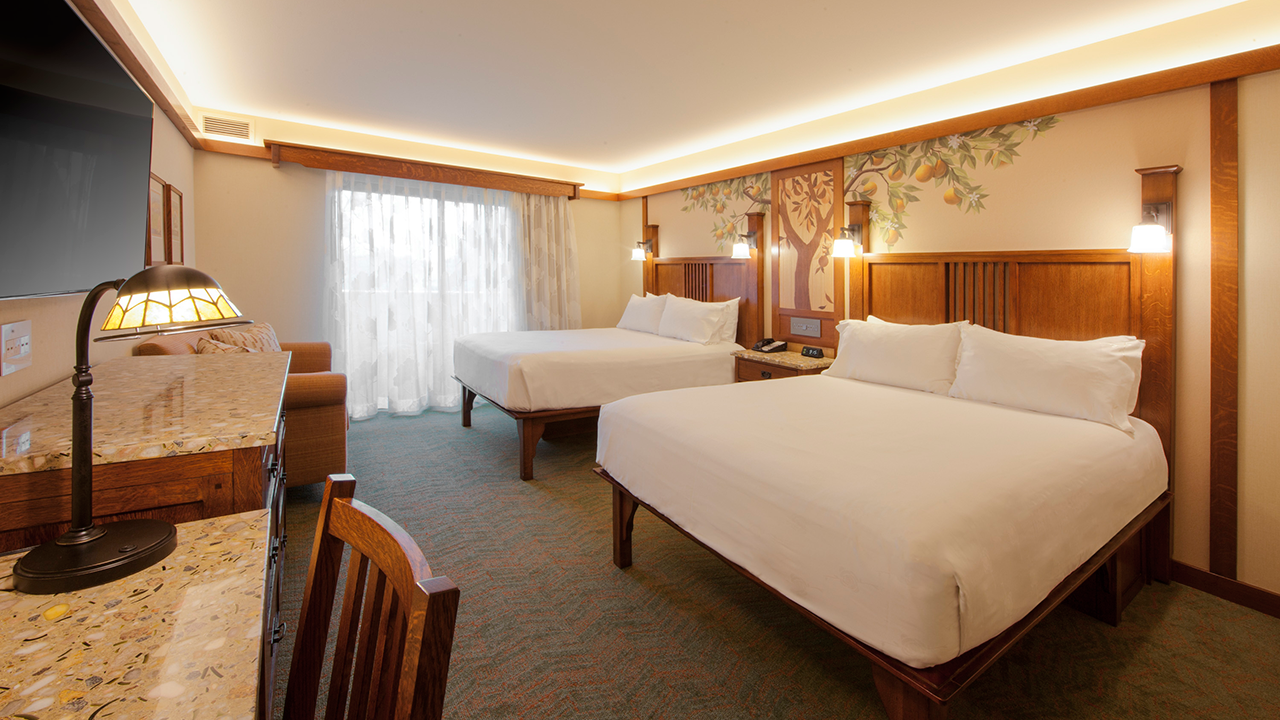 The guest rooms will all be redesigned to create a “fresh sense of luxury.” New floors, new walls, new furniture, and new bedding and linens are all part of the update. The new headboard walls will feature wood inlay designs of orange trees and Chip ‘n Dale.