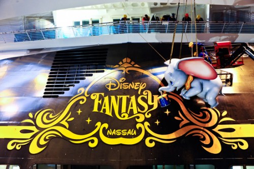 Disney Cruise Line is gearing up for the debut of its newest ship, the Disney Fantasy, this spring, and construction on the brand new ship is nearing completion. Recently, the ship celebrated an important construction milestone when Dumbo was officially placed on the stern of the ship.