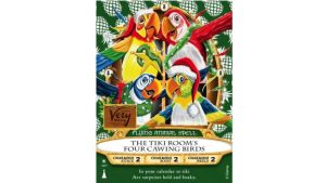 The card is inspired by Walt Disney’s Enchanted Tiki Room, and according to Disney’s backstory, “was whipped up by Merlin the Magician after he became enchanted with a quartet of caroling birds down in the tropics.”