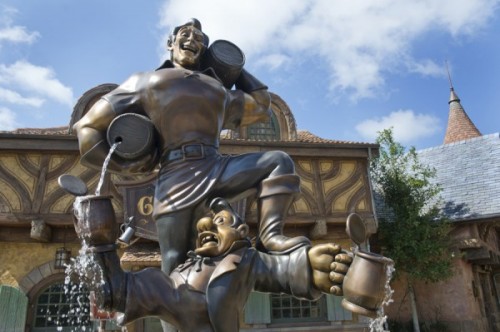 As you approach the Tavern, you’ll first spy this wonderful centerpiece fountain featuring Gaston and his fall guy buddy, Le Fou.