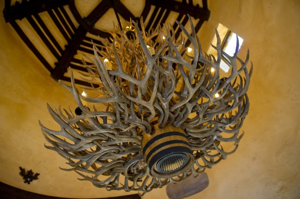 My favorite touch, though, is this amazing chandelier – proof that this outdoorsmen extraordinaire truly does use antlers in all of his decorating!