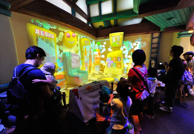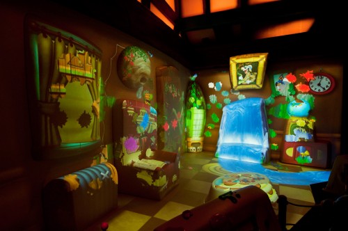 Goofy’s Paint and Play House takes place in, unsurprisingly, Goofy’s house, where Goofy is currently redecorating. Guests can help Goofy redecorate his room with the use of a “paint” shooting device called a Toontone Splat Master, which creates the appearance of paint flying out from the applicator and onto the walls or floor just by pulling a string or pushing a button. Guests work together to decorate the room using their Toontone Splat Masters, and different theme options, such as the beach and jungle, are available to help with the decorating.