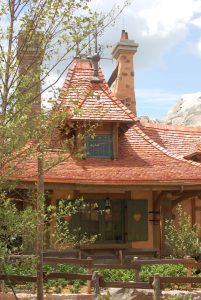 Maurice, Belle’s father, has a home fit for a tinkerer – both inside and out. The roof features mismatched chimneys and a “creative” weather vane, while the ground level sports heart shutters and hand-carved support beams. In fact, Walt Disney Imagineers painstakingly hand-carved and stained each support beam to look like wood. Additionally, the metal used to affix each beam to the house was made to look aged and weathered.