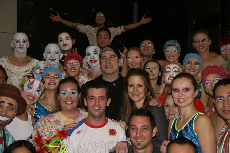 Superstar couple Kelly Preston and John Travolta, along with daughter Ella, took in a performance of “La Nouba” at the Cirque du Soleil Theatre at Downtown Disney on Saturday. After the 9 p.m. performance, the couple posed with the cast for a picture.
