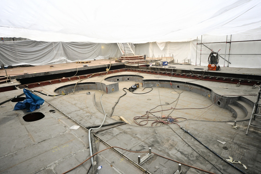 The Disney Cruise Line is still 145 days away from the maiden voyage of its latest gem, the “Disney Dream,” into their fleet of luxuriously fun ships. We’ve been following the construction and design progress of the “Dream” since the beginning and some really exciting things are starting to take shape! Today, the Disney Parks Blog released a photo showing the foundation to a very popular element aboard the Disney cruise ships – a Mickey Mouse pool!