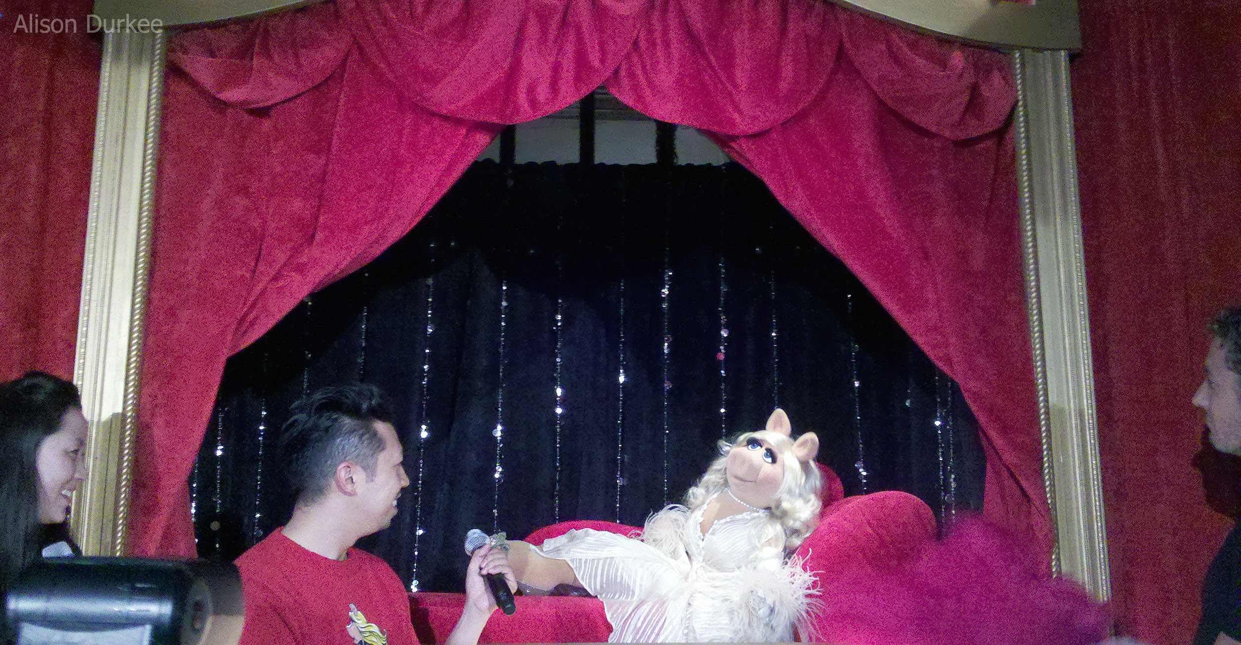 Yes, the one and only Miss Piggy herself was on hand in New York City for fashion retailer Opening Ceremony’s packed Fashion’s Night Out event at the Ace Hotel. Miss Piggy made two appearances throughout the night, where she helped to introduce Opening Ceremony’s new “Opening Ceremony x Muppets” clothing line, as well as promote her upcoming film The Muppets. Looking glamorous in silver heels and a flowing white dress, Miss Piggy greeted her adoring fans and talked with Opening Ceremony founders Carol Lim and Humberto Leon about such topics as preparing for Fashion’s Night Out by practicing her wave and air kisses, Kermit the Frog (who, Piggy says, is not a shopper, considering he generally doesn’t wear clothes), and her favorite french foods–which, Miss Piggy made clear, does not include frog legs. When asked about how she was preparing for her role as the editor of French Vogue in The Muppets, Miss Piggy discussed her research for the role, which included meeting with all the top designers in Paris, and “getting them to give [Piggy] one of everything they were making.” And one of the most memorable moments of the night came when an audience member asked what Miss Piggy was wearing, to which she sassily responded, “It’s called a dress. Jeez.”