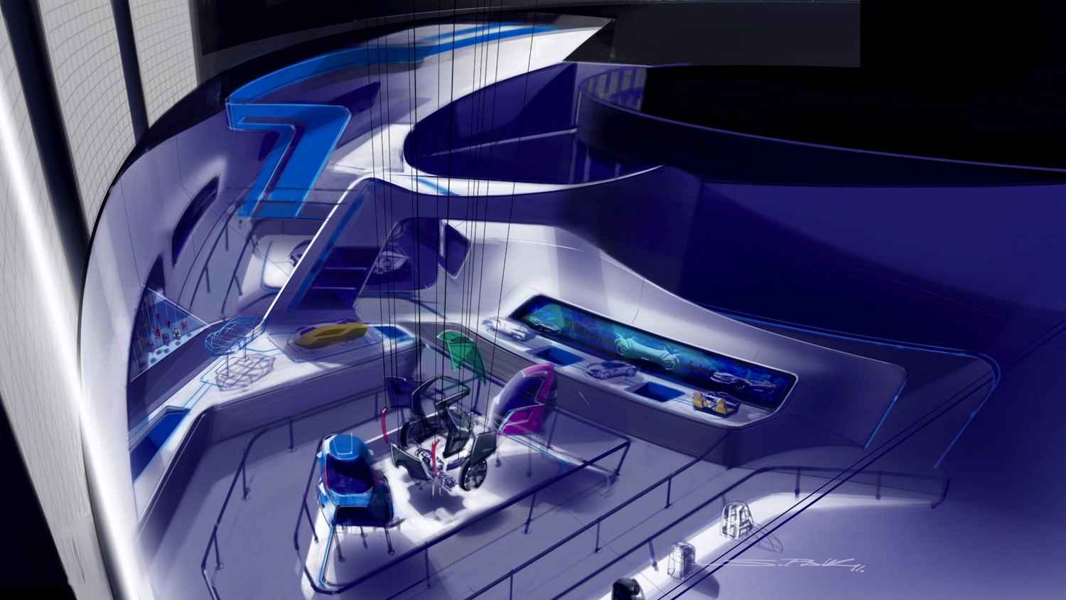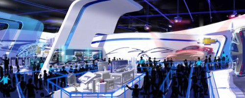 Finally, the attraction’s post-show will give guests the chance to race their custom vehicle on a digital driving table, record their own TV commercial starring their vehicle, pose for pictures with their design, and explore an elaborate showroom of Chevrolet vehicles. Take a look at some concept art for this post-show area below: