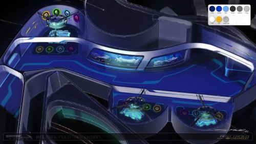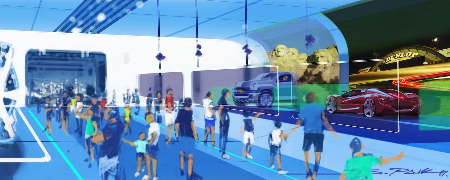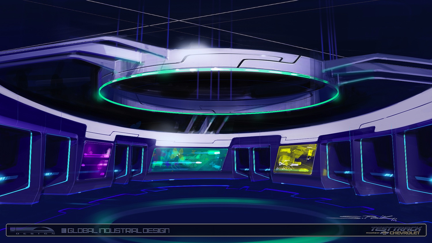 The attraction will begin with a sleek, modern queue and pre-show, in which guests will be able to design their own custom vehicles to use in the ride. Helpful hints from the Chevrolet designers will guide guests as they design their own car, truck, or crossover vehicle. Here are some pieces of concept art for the queue and preshow: