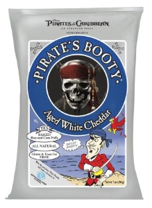 Pirate’s Booty is an all-natural, gluten-free snack made of puffed rice, corn, and white cheddar cheese. The snack is transfat free and contains 130 calories per one-ounce serving.