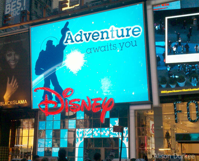 The experience of visiting the Times Square Disney Store doesn’t begin inside the store, but rather with it’s elaborate exterior. Featuring a facade made up of smaller video screens below a giant video screen that projects Disney videos, animations, and pictures to the crowds of Times Square, the exterior is perhaps as exciting as the inside of the store, as it entices you to come in and fits in perfectly with the energy and bright lights of Times Square.