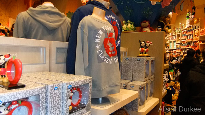 Upon entering, you find yourself on the lower level of the two-level store, which primarily features exclusive merchandise for the Times Square store. There is a large display of various NYC-themed Disney merchandise, including plushes, apparel, snowglobes, and numerous other products.