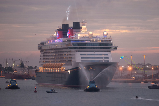 The beautiful and brand spankin’ new vessel sailed up the channel into Port Canaveral before dawn yesterday, arriving to cheers and a pre-dawn fireworks display.  Awaiting her were Mickey, Minnie, and a couple thousand cheering cast members and fans.