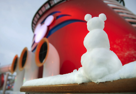 It’s not everyday that you see the decks of a Disney cruise ship dusted with the white stuff, so we thought you would enjoy a glimpse.  And what snowman is complete without a set of ears?
