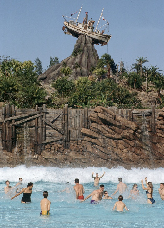Of course, Disney’s Typhoon Lagoon wouldn’t be complete without a touch of the famous Disney storytelling behind it. According to Disney legend, Typhoon Lagoon was formed in the wake of a gigantic storm. During this epic storm, boats and surfboards were tossed every which way – even onto mountains. In fact, the volcanic Mount Mayday, located directly behind the Surf Pool, is where you’ll find the stranded shrimp boat Miss Tilly, as well as most of the park’s waterslides and other attractions. Mount Mayday itself will attempt to blow up every half hour, shooting a tall geyser of water into the sky.