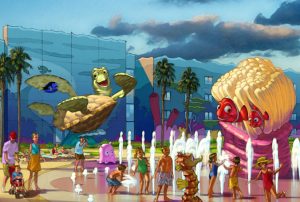 value pricing and plenty of sea-inspired decor, while the family suites will bring to life The Lion King, Cars, andFinding Nemo. Disney has been working with artists from the Walt Disney Animation Studios and Pixar Animation Studios on even the most trivial design details, including which scenes should be depicted at the swimming pools or which building elevations should be used. One of the main design elements will be a 35-foot-tall King Triton statue, which will reside over The Little Mermaid wing.